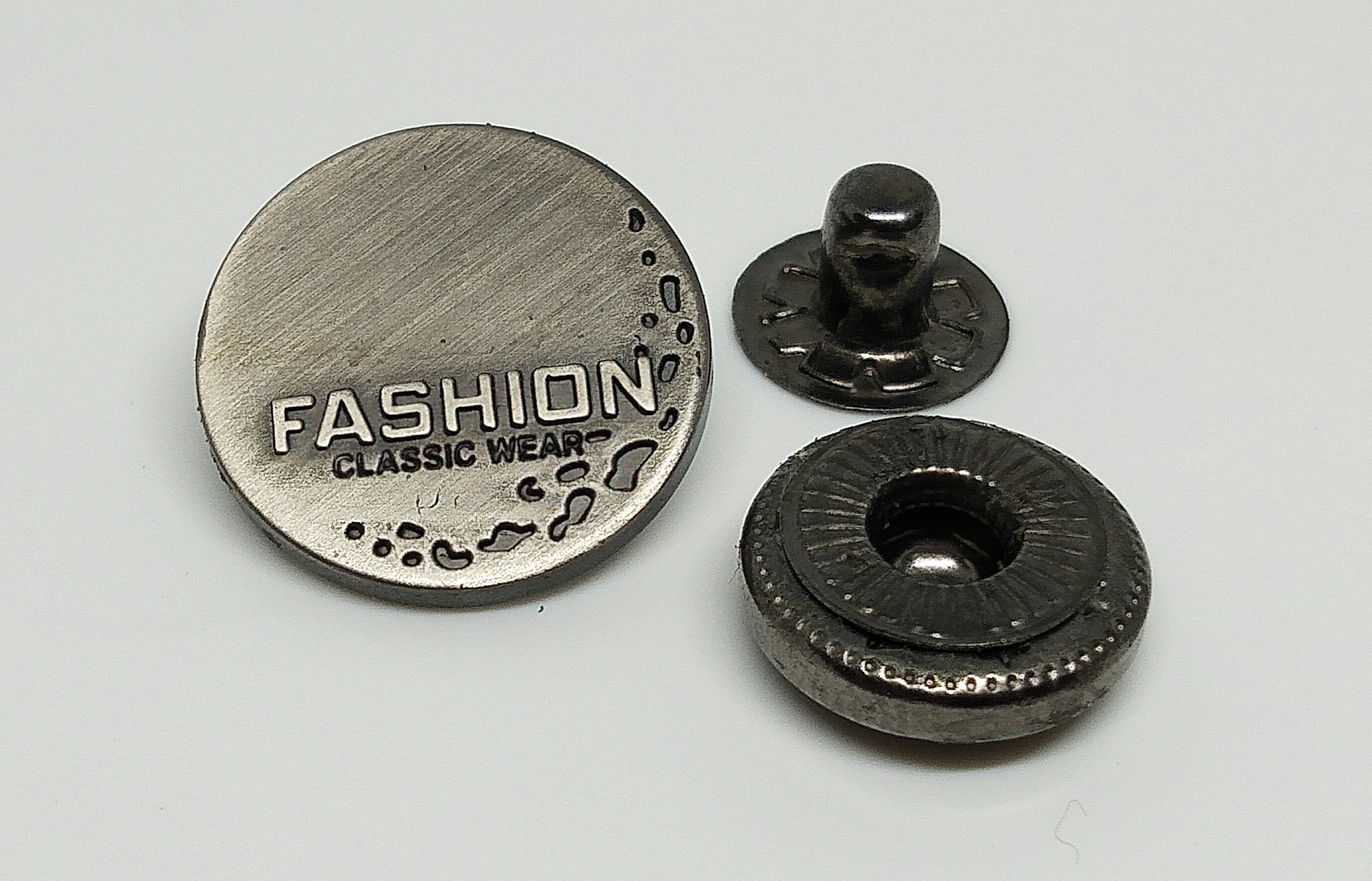 A snap fastener (also called press stud, popper, snap or titch) is a pair of interlocking discs, made out of a metal or plastic, commonly used in place of buttons to fasten clothing and for similar purposes. A circular lip under one disc fits into a groove on the top of the other, holding them fast until a certain amount of force is applied. Different types of snaps can be attached to fabric or leather by riveting with a punch and die set specific to the type of rivet snaps used (striking the punch with a hammer to splay the tail), sewing, or plying with special snap pliers. Product Type – Buttons Material – Metal Button Type – Snap Button Feature – Eco-friendly, Dry cleaning, Washable, Nickel-free, Lead-free Shape – Round Decoration – Custom Size – Custom Colour – Custom Place of Origin – India Advantages: 1. High Quality with competitive price, High Wear, Corrosion Resistance and Hardness 2. Prompt Delivery Time. For More Information Contact us: ASIA ENTERPRISES +91 9958035533 #metalbutton #chinabutton #pearlsnapbutton #plasticbutton #ringsnapbutton #alloybutton #snapbuttonforgarment #custommetalsnapbutton #fashionsnapbutton #jeansbuttonaccessories #metalbuttonmanufacturers #brassbuttonprice #wholesalegarmentbutton